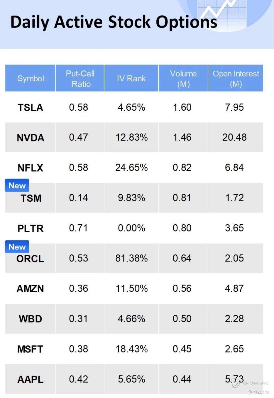 $Oracle(ORCL)$ ranked sixth with a neutral put/call ratio of 0.53 and a sky-high IV rank of 81.38%, signaling extreme volatility anticipation as volume hit 0.64 million contracts against 2.05 million in open interest. Shares tumbled more than 11% in extended trading after the company reported underwhelming cloud segment growth, with overall cloud revenues up 34% to $7.98 billion and infrastructure climbing 68% to $4.08 billion—figures that fell short of forecasts and highlighted delays in converting recent large AI contracts into actual income.