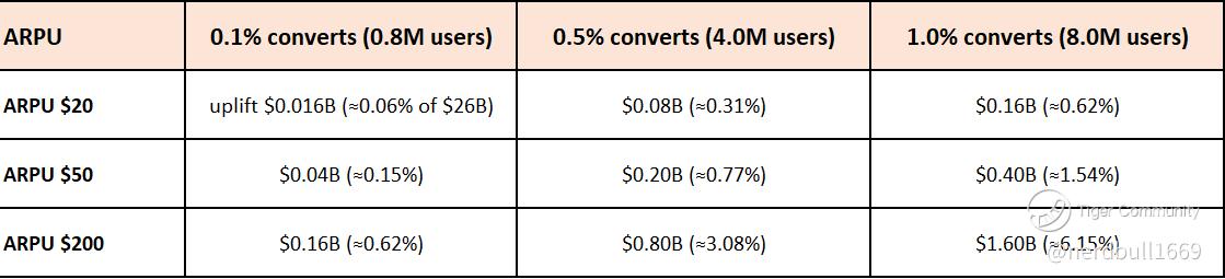 We used company guidance and public announcements as anchor points. We did not assume any confidential metrics (conversion rates or internal ARPU changes) beyond the scenarios shown. The sensitivity table explicitly shows how much monetization matters; small conversion rates with low ARPU create only small revenue uplifts vs. a large base.