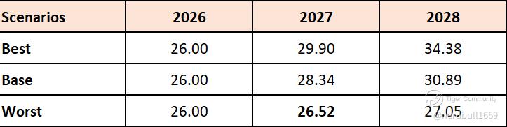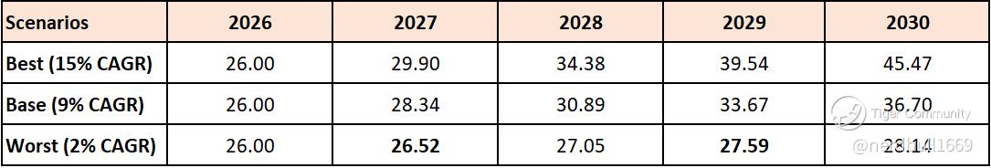 Method: start = FY2026 revenue US$26.0B; apply simple constant CAGR for each scenario. (These are illustrative scenario runs — they show direction and scale, not a point forecast.)
