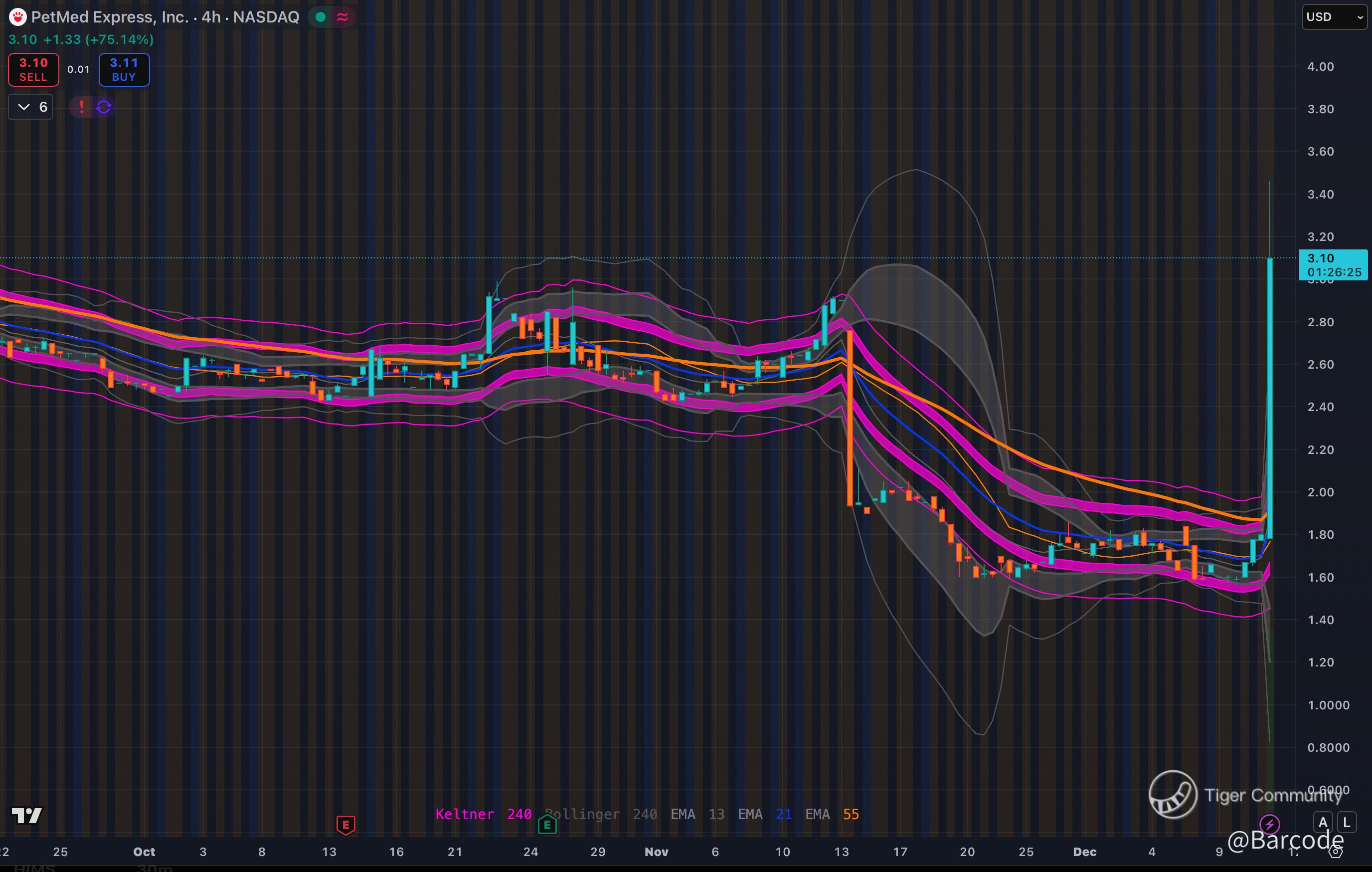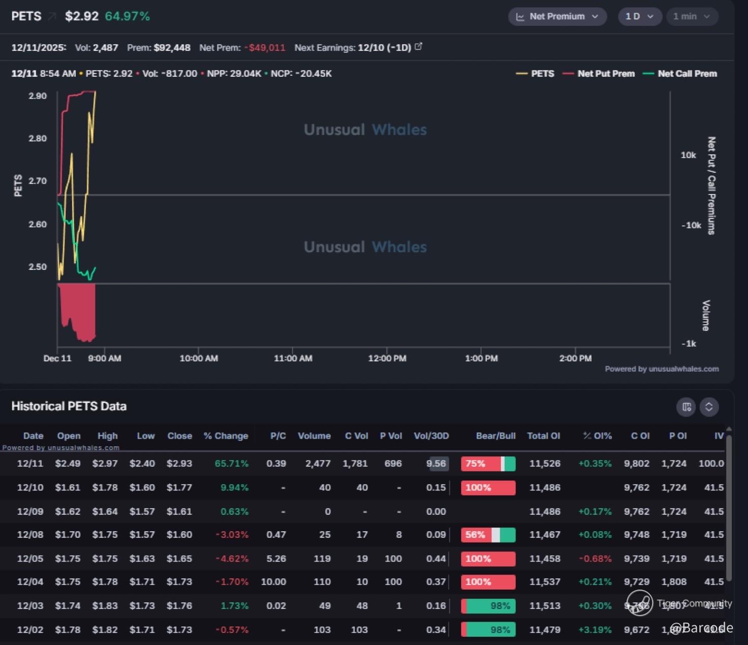 Iβm convinced this is one of the cleanest microcap takeover momentum structures of the quarter. $PETS is detonating more than +80% after SilverCape Investments launched a $4 per share take private proposal that represents a 130% premium to yesterdayβs close. Liquidity spiked instantly, and unusual_whales flagged an aggressive imbalance. Net premium printed minus $49K early, yet call side activity accelerated the moment price reclaimed VWAP and surged through the first liquidity shelf.
