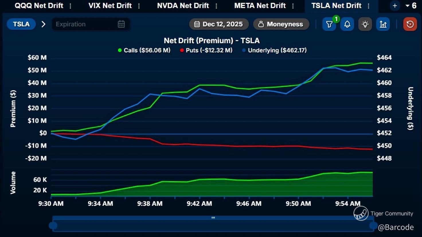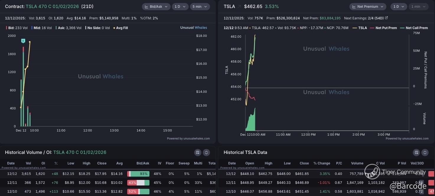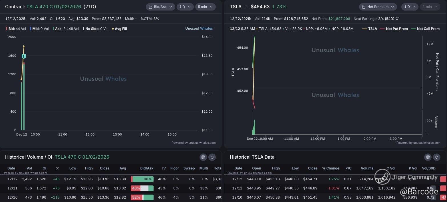 On the options side, I’m tracking a $TSLA position now carrying about $5.1M in premium. More importantly, someone stepped in with roughly $3.3M into the $470 calls expiring 02Jan2026. That is not a punt. That is long-dated conviction, layered on top of consistently call-heavy flow.