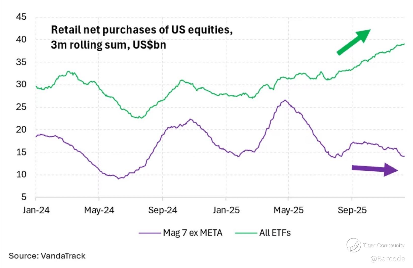I’m also watching flow data showing retail investors fading the Mag 7 since midyear and rotating toward ETFs instead. This is not panic. It is maturation. A generation of investors is diversifying exposure rather than concentrating risk in single names.