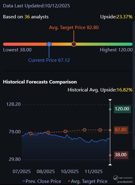 Based on 36 analysts from Tiger Brokers app offering 12 month price targets for Nike in the last 3 months. The average price target is $82.80 with a high forecast of $120.00 and a low forecast of $38.00. The average price target represents a 23.37% change from the last price of $67.12.