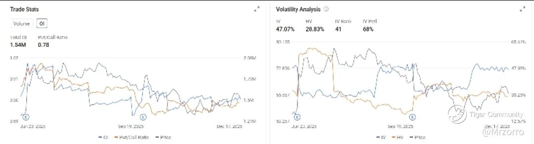 ~Volatility: Implied Volatility (IV) has reached 47%, significantly higher than Historical Volatility (HV ≈ 29%).