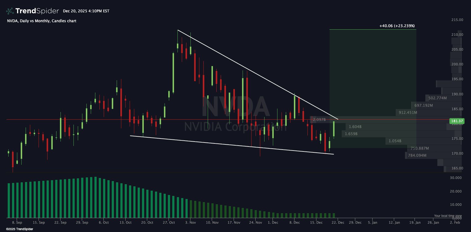 $180 is the key pivot: a clean break above that Point of Control opens a volume gap that can fuel a ~20% leg over the next two months.