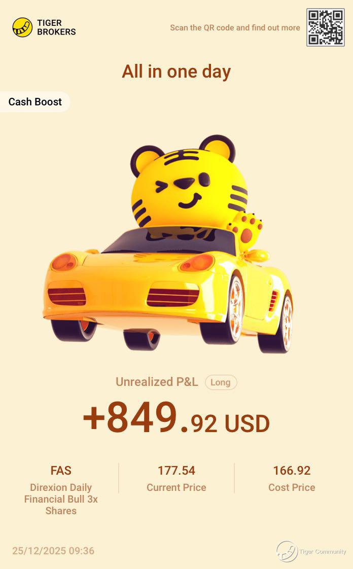 $Direxion Daily Financial Bull 3x Shares(FAS)$ is on a roll! 1.73% gain on Christmas rally plus $0.3874 per share dividend – double wins are amazing!