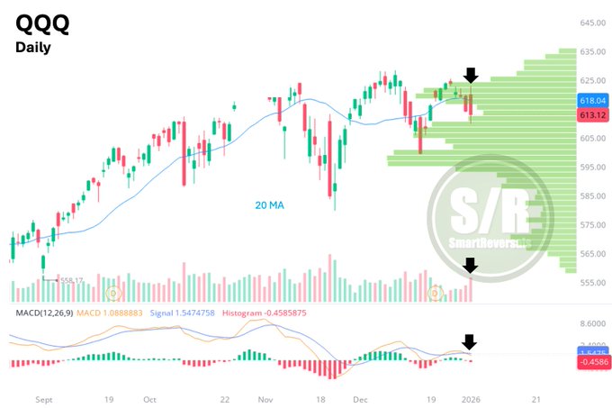 Bearish engulfing candle validated by high daily volume, the 20DMA was lost and the MACD crossover suggests a trend reversal.