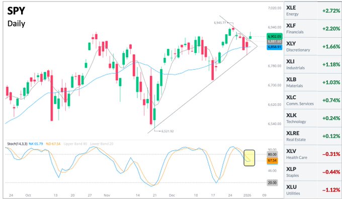 The narrowing price action suggests a potential bullish resolution. While Tech bounced, the actual drivers were Energy, Financials, Discretionary, and Materials.