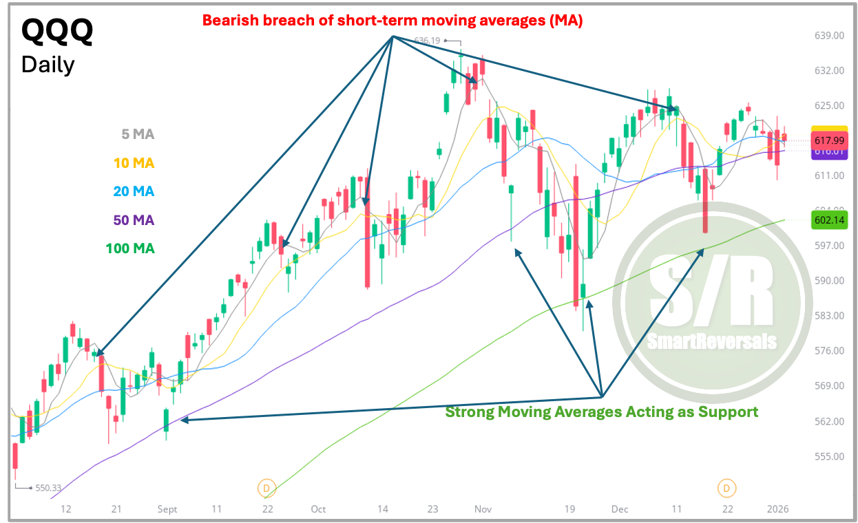 The chart below highlights the importance of losing the 5 and 10 MA in the case of QQQ. For some traders and investors, a break below these averages may be interpreted as a potential sell signal, while a recovery above them may suggest a buy opportunity. This is not presented as a strict rule, but rather as an example of how having clear criteria can improve Moving Average analysis and support more disciplined decision-making.
