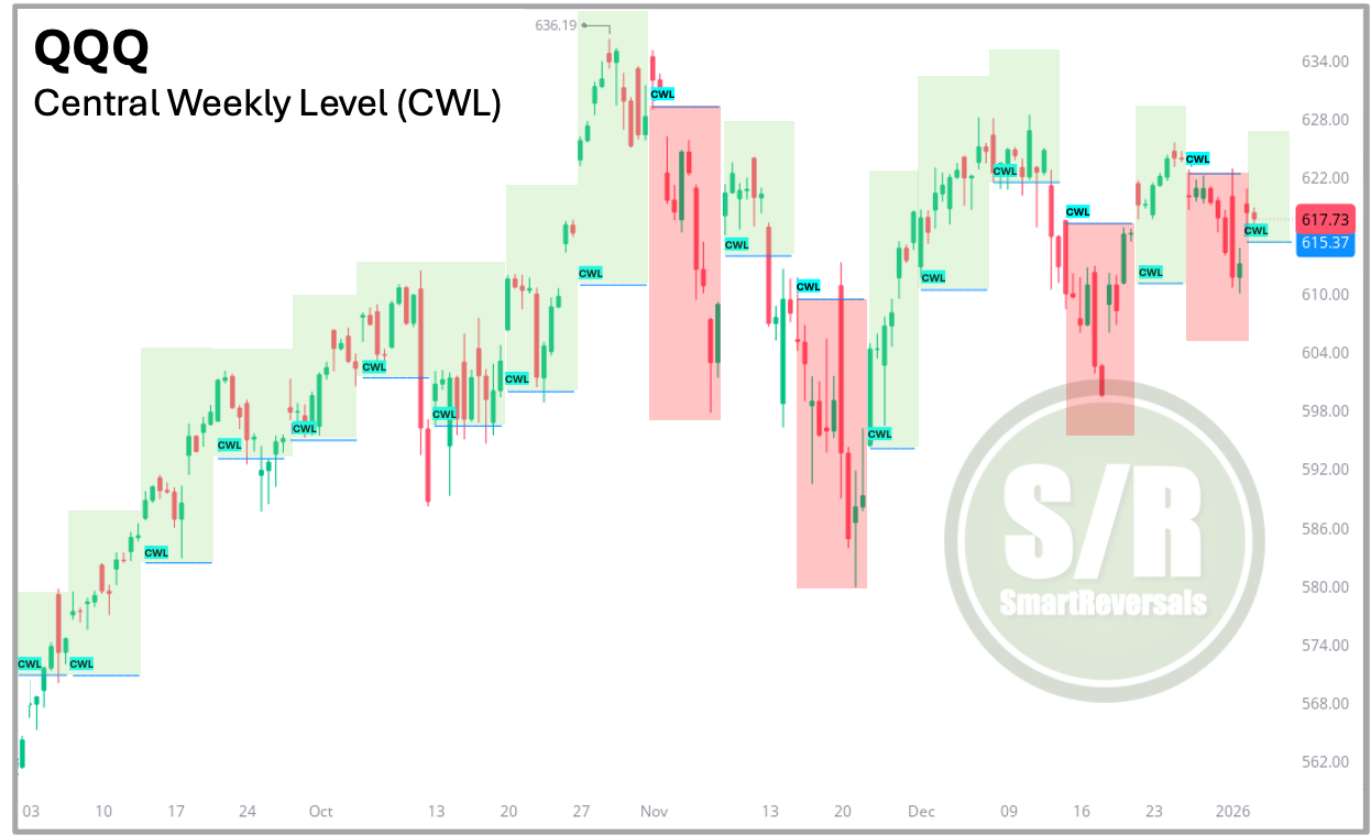 As a final refinement, rather than waiting for the loss of the Central Monthly Level (CML) or a breakdown of the 10 or 20 Moving Averages, I rely on the Central Weekly Level (CWL). This level is updated every Friday for the week ahead and provides subscribers with a precise reference point to evaluate short-term price behavior. The CWL helps confirm whether a pullback is developing, particularly when price is overbought and subsequently moves below this level, or whether a bounce is gaining traction, as illustrated in the QQQ example shown below