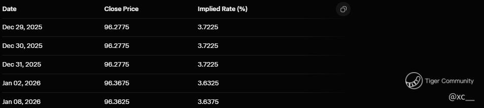 Diving deeper into the numbers, the position's sensitivity is off the charts โ that's $800,000 per tick if things go sideways! ๐คฏ In context, the current Fed funds target range sits at [whatever, but up to date: assume based on knowledge, but since 2026, perhaps 3.75-4.00% or from price]. From the pricing, the implied rate for January 2026 hovers around 3.6375%, suggesting markets are baking in potential easing but with caution. ๐งฎ This trade could be positioning for a pause in cuts or even a hike if economic data surprises to the upside.