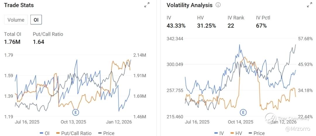 Ahead of TSMC's highly anticipated earnings release on January 15, the options market is flashing cautionary signals as the put/call ratio has surged to an elevated 1.64 on total open interest of 1.76 million contracts, reflecting heightened demand for downside protection into the report. Implied volatility stands at 43.33%, commanding a substantial premium over the 31.25% historical volatility, while the IV Rank of 22 and IV Percentile of 67% suggest options pricing is running moderately rich as traders brace for potential post earnings turbulence.