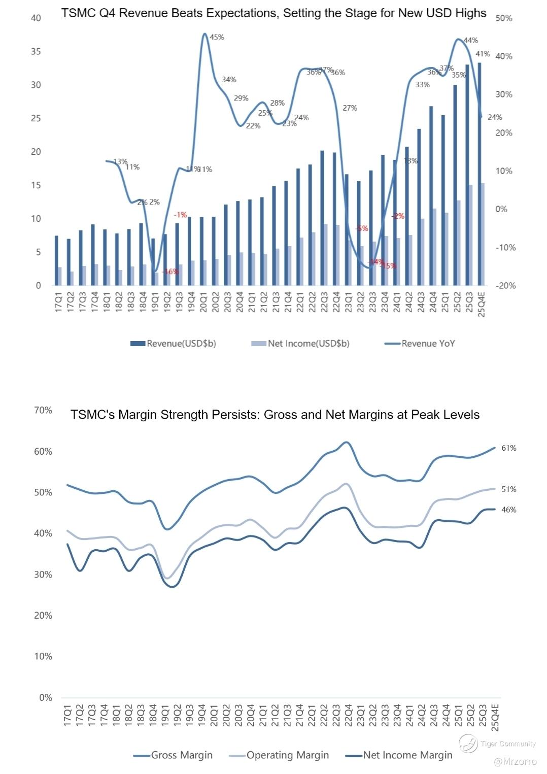 It is worth noting that exchange rate fluctuations have a significant impact on financial results, leading to a notable discrepancy between NTD-based and USD-based performance. Based on the Q4 exchange rate guidance (USD/NTD=30.6) provided in last quarter's earnings report, Q4 revenue in USD terms would reach US$34.19 billion, already exceeding the guidance range of US$32.2-33.4 billion.