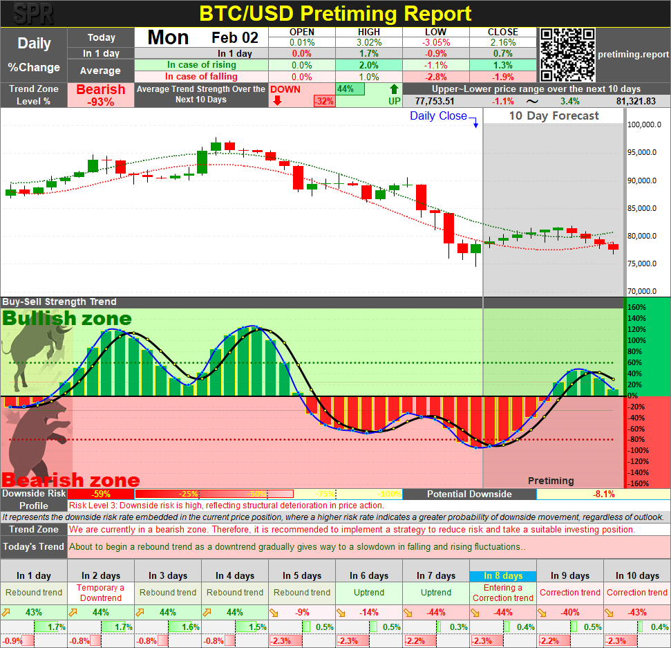 This Daily Market Timing Analysis for BTC/USD evaluates price behavior as of the Feb 02, 2026 close, focusing on bearish trend structure, rebound transition signals, downside risk asymmetry, and probability-based trend forecasts. The report is designed to help investors distinguish between short-term rebound participation and unresolved structural downside risks within the broader bearish regime.
