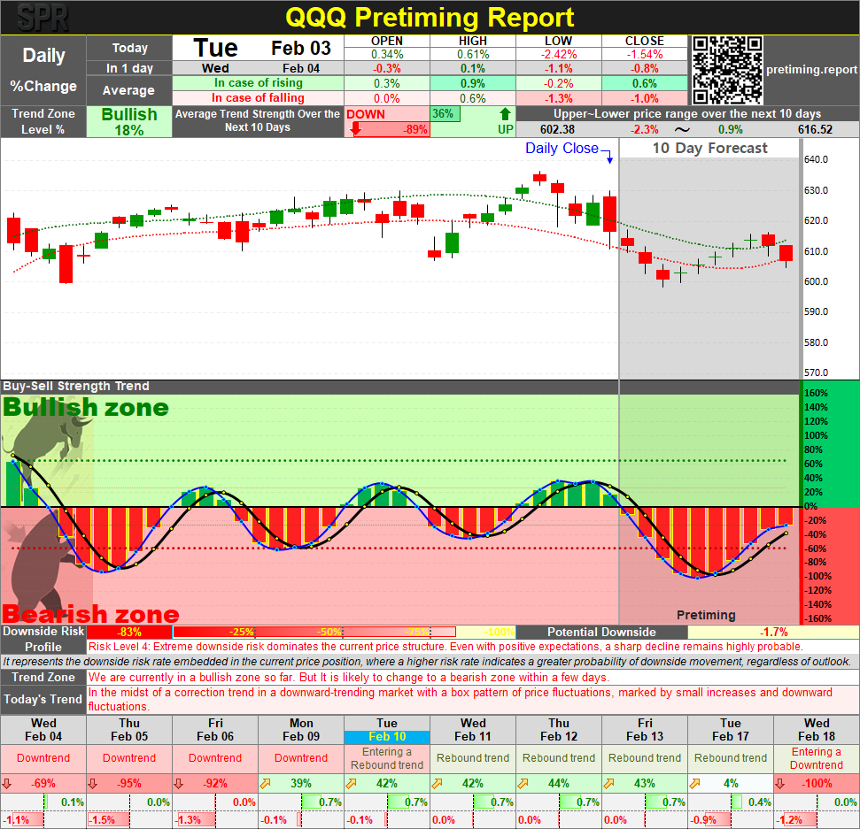 This Daily Pretiming Report provides a structured, data-driven analysis of QQQ based on observed price action, trend probabilities, and risk metrics as of the latest market close. The report is designed to help investors clearly understand current market conditions, assess downside risk, and align both short-term trading decisions and long-term portfolio strategy with evolving trend dynamics.