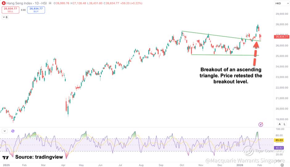 If the price pullback towards the possible supports of 26200-26400 and shows bullish price actions, call warrants $HSI 29200MBeCW260330(ROSW.SI)$ (https://warrants.com.sg/tools/livematrix/ROSW) may be relevant for expressing a bullish short-term view.