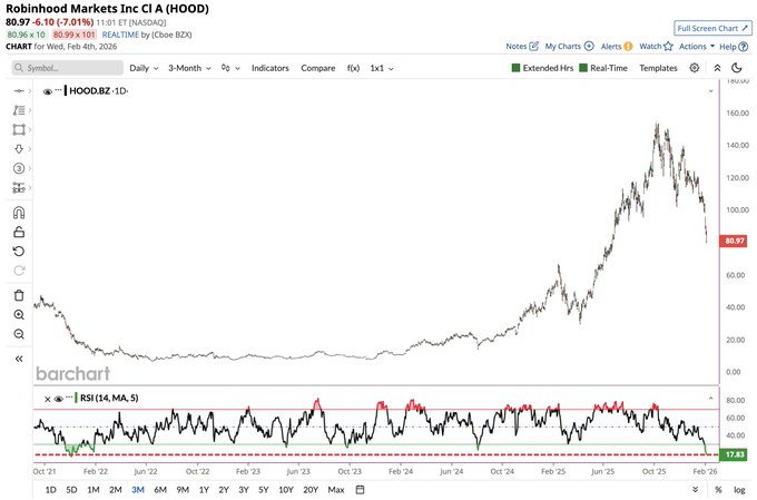 Markets are showing dramatic volatility with historic lows in $PYPL$ and $PLTR$, oversold extremes in $HOOD$, and technical breakdowns in $QQQ$, while $AAPL$ bucks the trend with a 12% rebound.