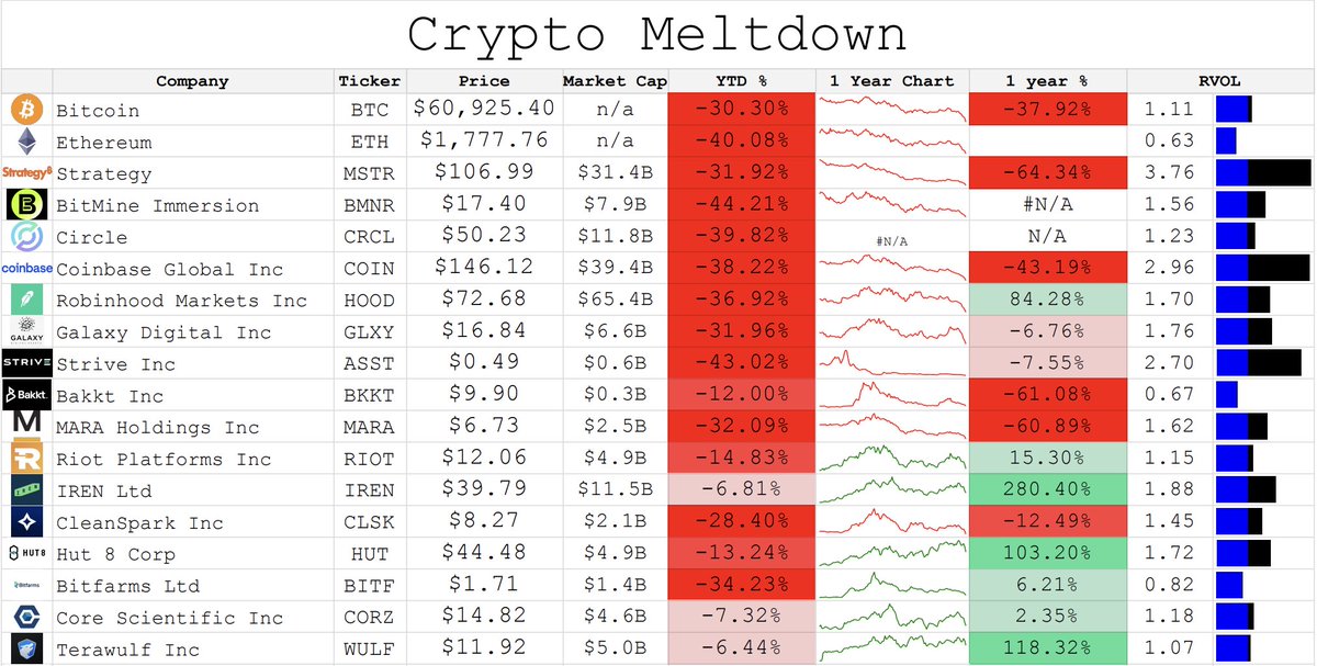 Bitcoin, Ethereum, and major crypto-linked equities—from $MSTR$ and $COIN$ to miners like $MARA$ and $RIOT$—are all deep in drawdown territory.
