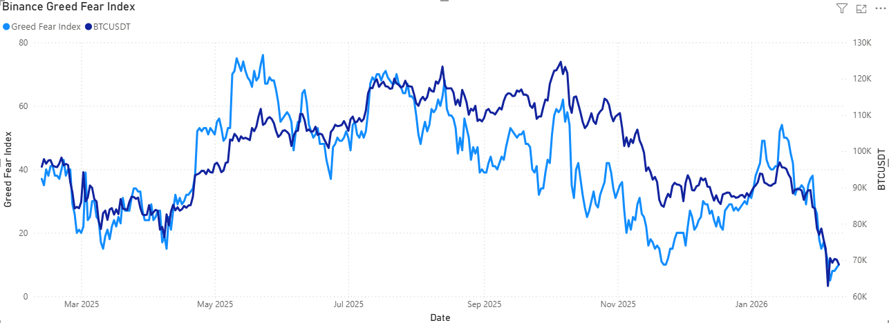 Basis Binance Greed Fear Index, it was max fear at 5 on 6 Feb 2026, gradually moving up to 10 now.