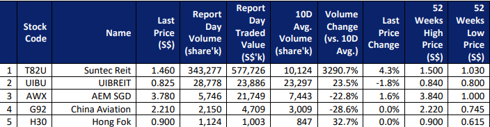 $Suntec Reit(T82U.SI)$ $UIBREIT(UIBU.SI)$ $AEM SGD(AWX.SI)$ $China Aviation(G92.SI)$ $Hong Fok(H30.SI)$