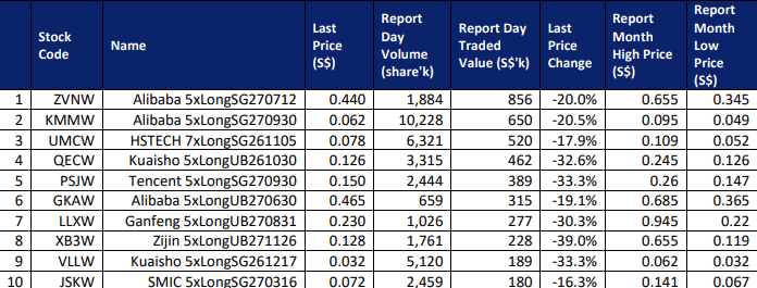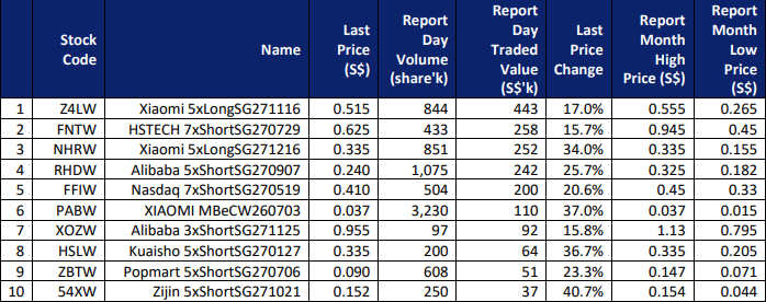 $Xiaomi 5xLongSG271116(Z4LW.SI)$ $HSTECH 7xShortSG270729(FNTW.SI)$ $Xiaomi 5xLongSG271216(NHRW.SI)$ $Alibaba 5xShortSG270907(RHDW.SI)$ $Nasdaq 7xShortSG270519(FFIW.SI)$ $XIAOMI MBeCW260703(PABW.SI)$ $Alibaba 3xShortSG271125(XOZW.SI)$ $Kuaisho 5xShortSG270127(HSLW.SI)$ $Popmart 5xShortSG270706(ZBTW.SI)$ $Zijin 5xShortSG271021(54XW.SI)$