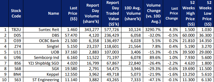 Turnover focused on yield and banks like Suntec REIT, DBS Group, and OCBC Bank, with REITs still hitting highs.
