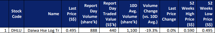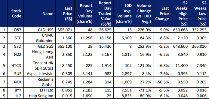 $GLD US$(O87.SI)$ $CNMC Goldmine(5TP.SI)$ $GLD SG$(GSD.SI)$ $Hong Leong Asia(H22.SI)$ $Tencent HK SDR 10to1(HTCD.SI)$ $Aspial Lifestyle(5UF.SI)$ $Reclaims Global(NEX.SI)$ $EFH Ltd(8YY.SI)$ $Hiap Seng Ind(1L2.SI)$