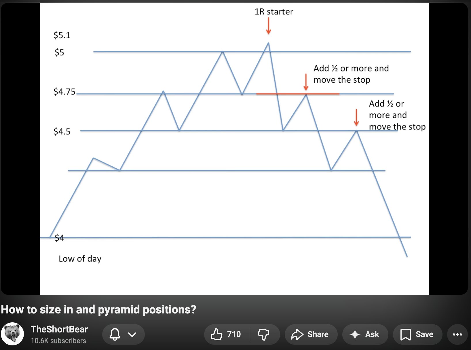 - starter entry at $100, stop at $95 (risking 5%)