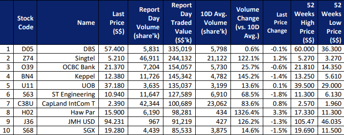 $DBS(D05.SI)$ $Singtel(Z74.SI)$ $OCBC Bank(O39.SI)$ $Keppel(BN4.SI)$ $UOB(U11.SI)$ $ST Engineering(S63.SI)$ $CapLand IntCom T(C38U.SI)$ $Haw Par(H02.SI)$ $JMH USD(J36.SI)$ $SGX(S68.SI)$