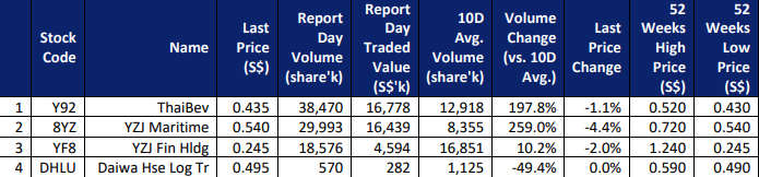 $ThaiBev(Y92.SI)$ $YZJ Maritime(8YZ.SI)$ $YZJ Fin Hldg(YF8.SI)$ $Daiwa Hse Log Tr(DHLU.SI)$
