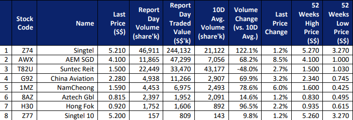 $Singtel(Z74.SI)$ $AEM SGD(AWX.SI)$ $Suntec Reit(T82U.SI)$ $China Aviation(G92.SI)$ $NamCheong(1MZ.SI)$ $Aztech Gbl(8AZ.SI)$ $Hong Fok(H30.SI)$ $Singtel 10(Z77.SI)$