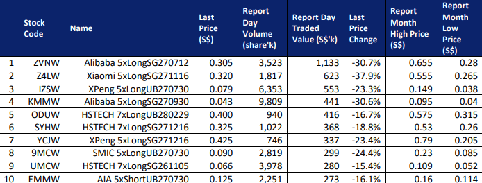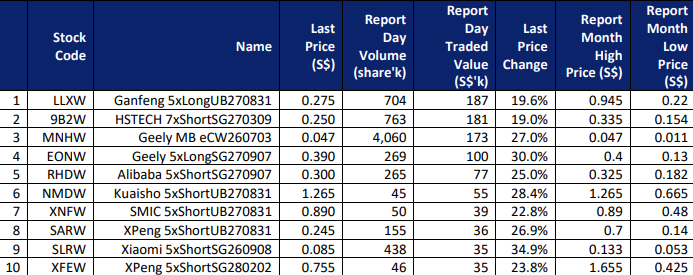 $Ganfeng 5xLongUB270831(LLXW.SI)$ $HSTECH 7xShortSG270309(9B2W.SI)$ $Geely MB eCW260703(MNHW.SI)$ $Geely 5xLongSG270907(EONW.SI)$ $Alibaba 5xShortSG270907(RHDW.SI)$ $Kuaisho 5xShortUB270831(NMDW.SI)$ $SMIC 5xShortUB270831(XNFW.SI)$ $XPeng 5xShortUB270831(SARW.SI)$ $Xiaomi 5xShortSG260908(SLRW.SI)$ $XPeng 5xShortSG280202(XFEW.SI)$