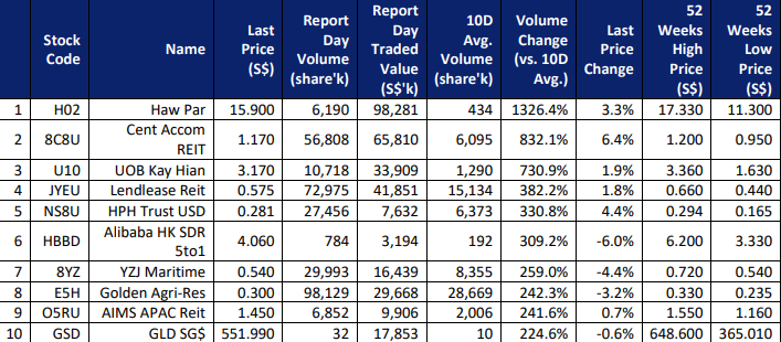 $Haw Par(H02.SI)$ $Cent Accom REIT(8C8U.SI)$ $UOB Kay Hian(U10.SI)$ $Lendlease Reit(JYEU.SI)$ $HPH Trust USD(NS8U.SI)$ $Alibaba HK SDR 5to1(HBBD.SI)$ $YZJ Maritime(8YZ.SI)$ $Golden Agri-Res(E5H.SI)$ $AIMS APAC Reit(O5RU.SI)$ $GLD SG$(GSD.SI)$