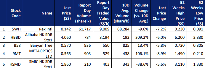 $Rex Intl(5WH.SI)$ $Alibaba HK SDR 5to1(HBBD.SI)$ $Banyan Tree(B58.SI)$ $METAOPTICS LTD(9MT.SI)$ $SMIC HK SDR 5to1(HSMD.SI)$