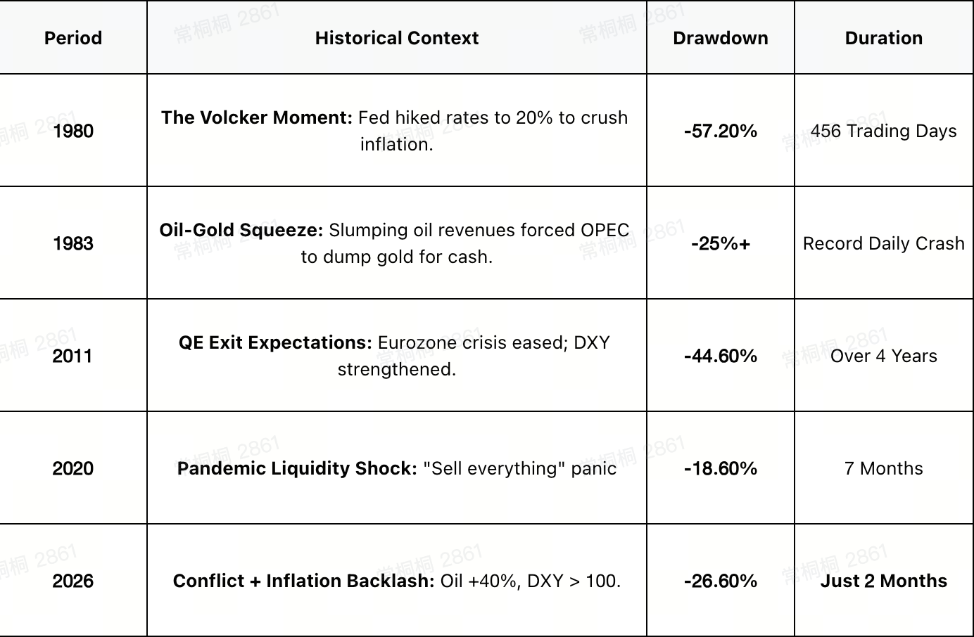 The script of "Geopolitical Shock - Resurgent Inflation - Forced Liquidation" has played out four times in the last 46 years. The 2026 iteration is distinguished by its unprecedented speed.