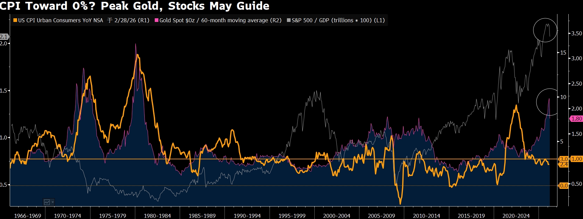 As gold surged, the S&P 500-to-GDP ratio also peaked at a 100-year high. With CPI hovering below 3%, a "normal" return to the mean points toward a 0% premium (a significant further drop in price).