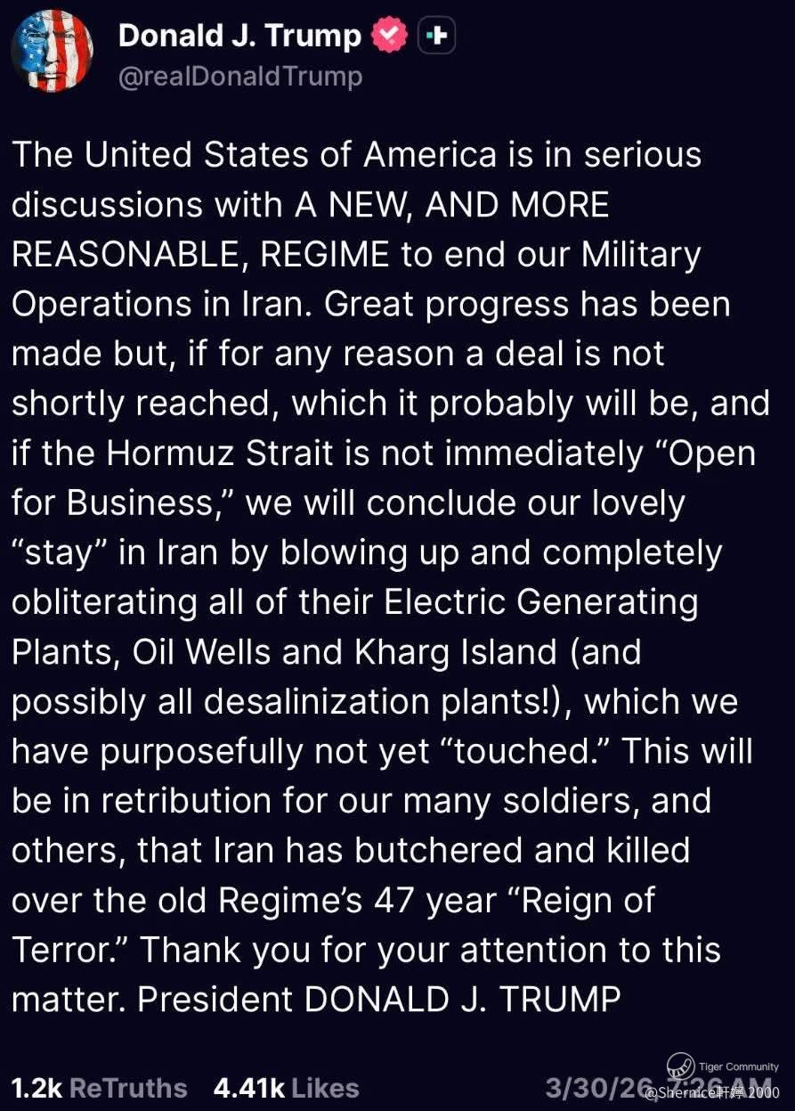 ⚡ He claims progress toward peace — yet threatens devastating strikes on Iran’s energy and civilian infrastructure if a deal isn’t reached soon.
