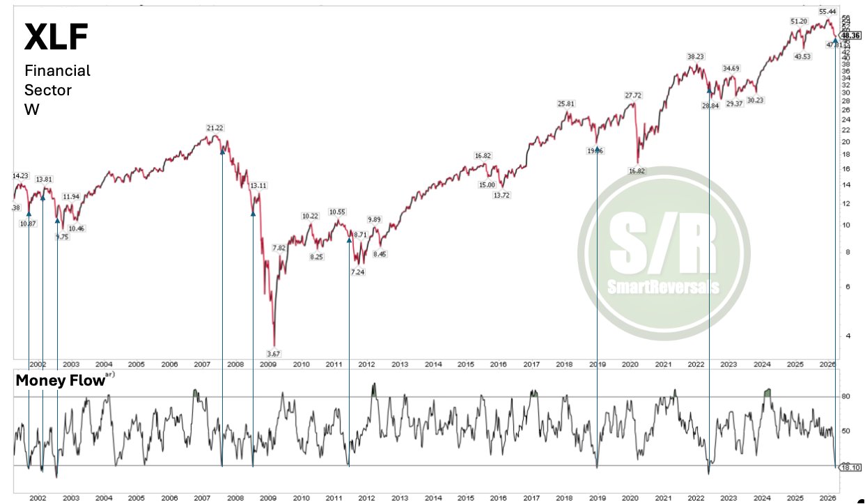 $Financial Select Sector SPDR Fund(XLF)$ : The Money Flow Index for the Financial Sector closed last Friday at historical lows: levels seen only 8 times in the last 25 years.