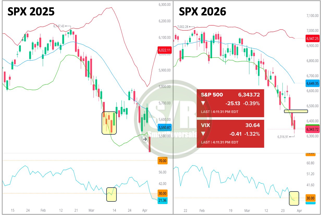 The similarity to 2025 is impressive, especially with the RSI below 30 and the lower Bollinger Band breached; both oversold conditions that preceded a bounce.
