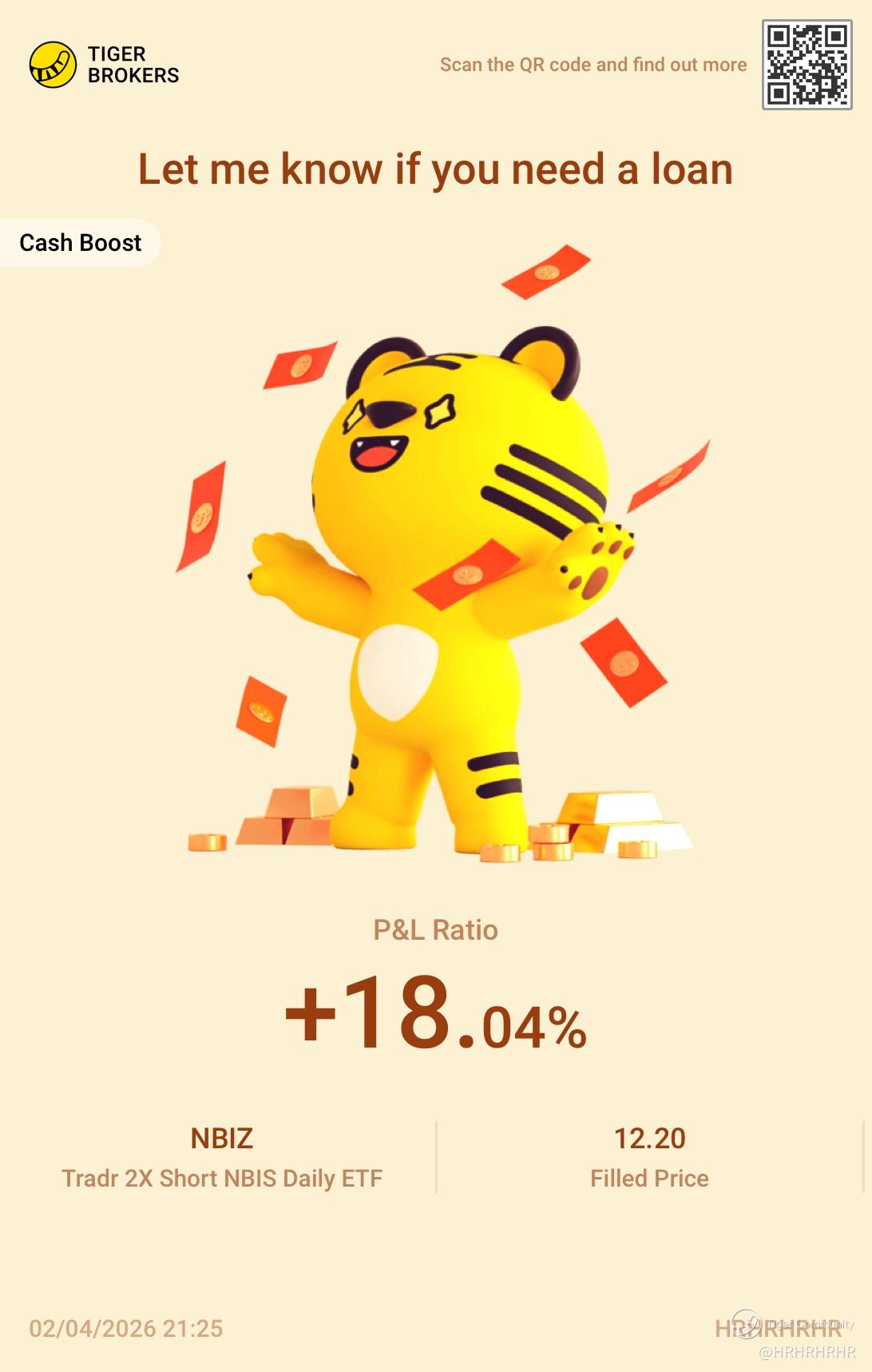 $Tradr 2X Short NBIS Daily ETF(NBIZ)$ $NEBIUS(NBIS)$ Shorted Nebius during Trump speech on potential war extension this morning and got this crazy return on CBA! [Sly] [Sly] [Sly]