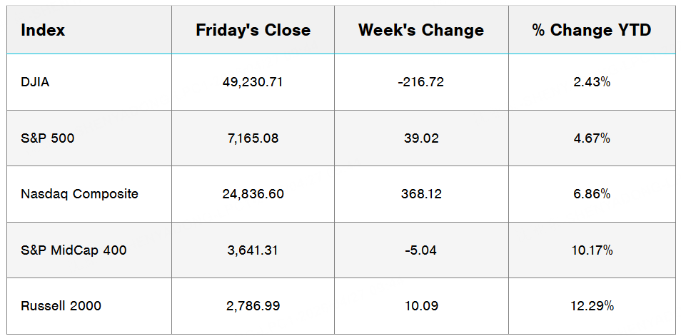Most major U.S. stock indexes finished higher for the week, with the Nasdaq leading gains. Optimism around AI, strong earnings, and positive economic data helped offset persistent U.S.-Iran conflict concerns, though the Dow declined.