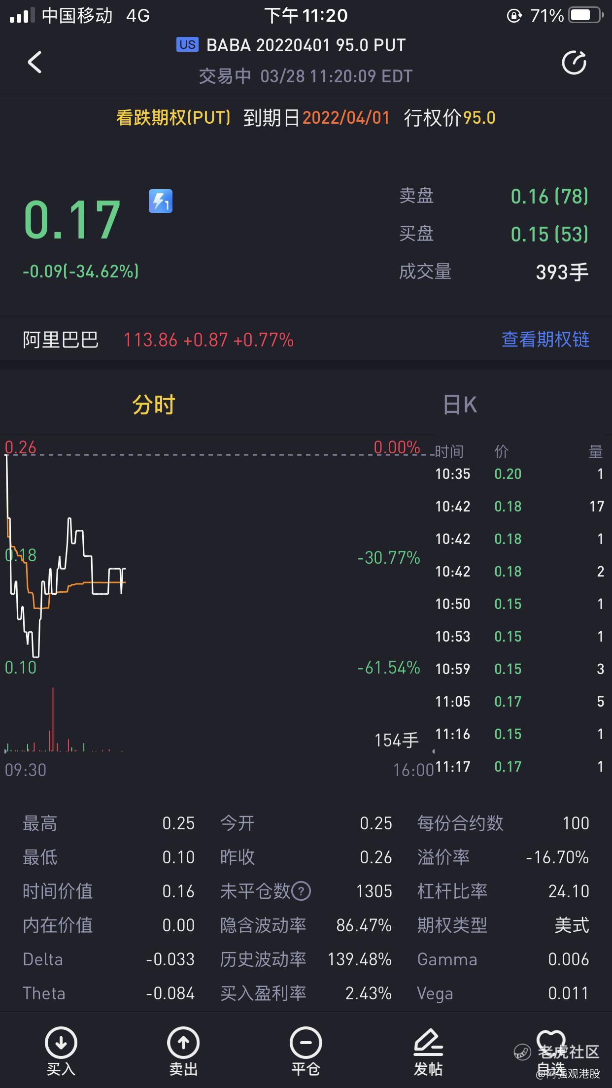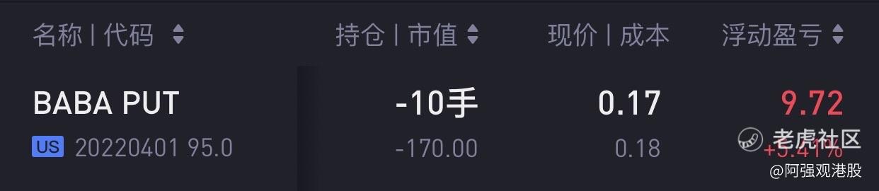 原因:挑選阿里賣put,是由於阿里鉅額回購,覺得4月1日,則本週五跌到95美金的概率不大,同時如果本週五大跌到95,我也想抄底阿里的股票