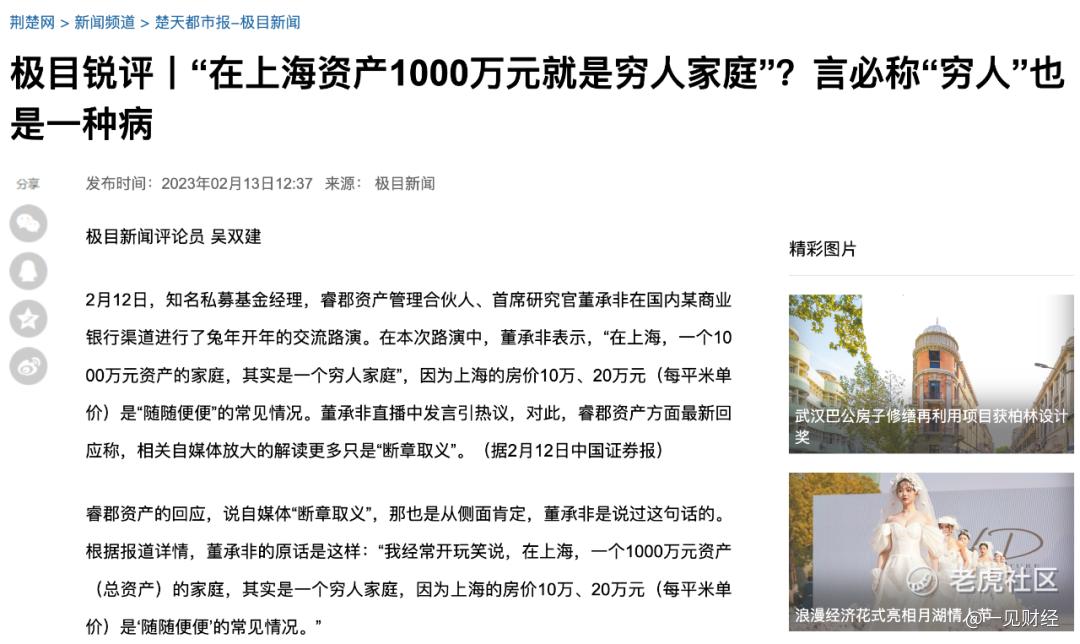 有人認爲董承非販賣焦慮,畢竟在中國超過6億人的月薪不足1000元,1000萬資產是很多人一輩子也賺不到的;也有人認爲,這個觀點很合理,算上房產,在上海總資產能到1000萬的大有人在,如果沒有其他收入,生活也比較拮据。