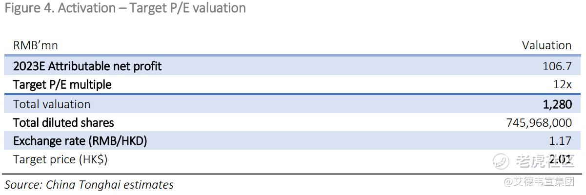 Maintain Buy rating with a revised TP of HK$2.01 We maintain our BUY rating for Activation with a revised TP of HK$2.01 based on 12x 2023E P/E, as we roll forward our valuation to 2023E based on the same 12x target P/E. Such TP implied 105% upside potential from current levels. Such valuation is supported by our expectation for its NP CAGR of 71.1% in 2022-24E. On the back of our expected earnings recovery, we believe Activation’s share price is heading for a re-rating. We believe such valuation is justified by (i) the company’s leading market position; (ii) the massive potential for its new livestreaming e-commerce business; (iii) the solid growth of consumption power on luxury products in Mainland China in the near future; and (iv) increasing marketing budget of premium brands in Mainland China on the back of the recovery from the pandemic-hit results this year. We assume the payout ratio of Activation to be no less than 20% in the coming few years as the company is expected to generate strong cash flow. This assumption gives us an expected DPS of 3.35 HK cents in 2023E, representing an expected yield of about 3.4% at the current price