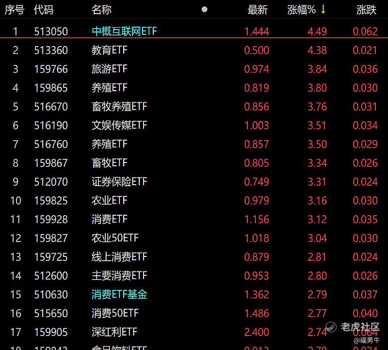 今天ETF池裏品種比較多,有中概互聯、教育、旅遊、養殖、消費ETF都在前面,最近那麼多天第一次百花齊放,稍後給大家講講中概互聯的事情。