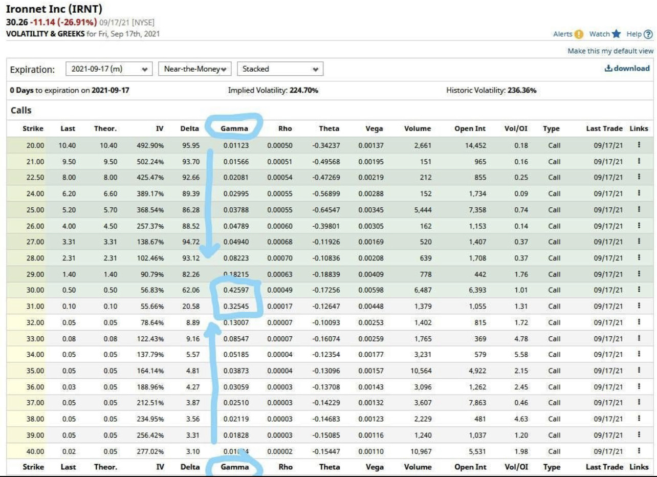 Let’s look at IRNT for next week. Do you know what you nitwits have done? You’ve opened up massive open interest far out of the money and there’s almost ZERO in the money calls open. You want a gamma squeeze you’re gonna have to get sell off those OTM options and buy at the money. I promise you, the share price will not reach your $70 strike option without significant buy volume. The market makers are bringing the majority of the volume as they delta hedge, and they’re not going to hedge all those calls that are $40 out of the money. There’s zero reason to. In fact, as we approach expiration, their delta gets LOWER and shares are SOLD by market makers. Don’t shoot yourself in the foot!
