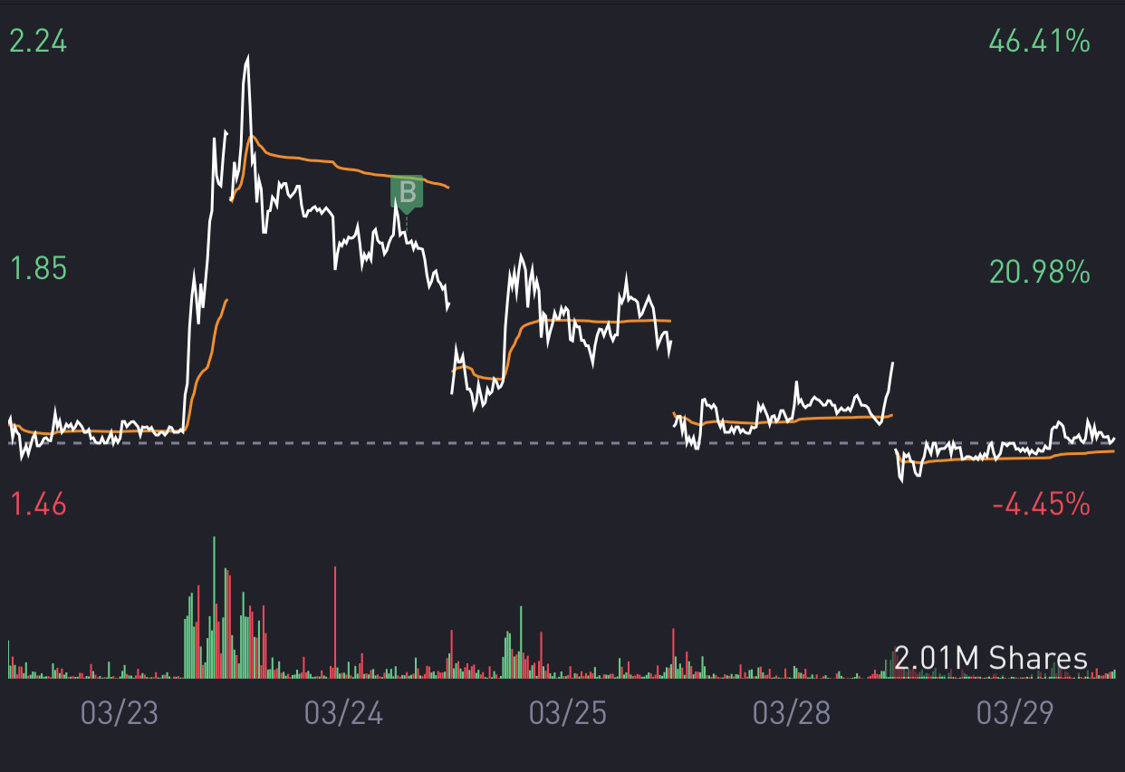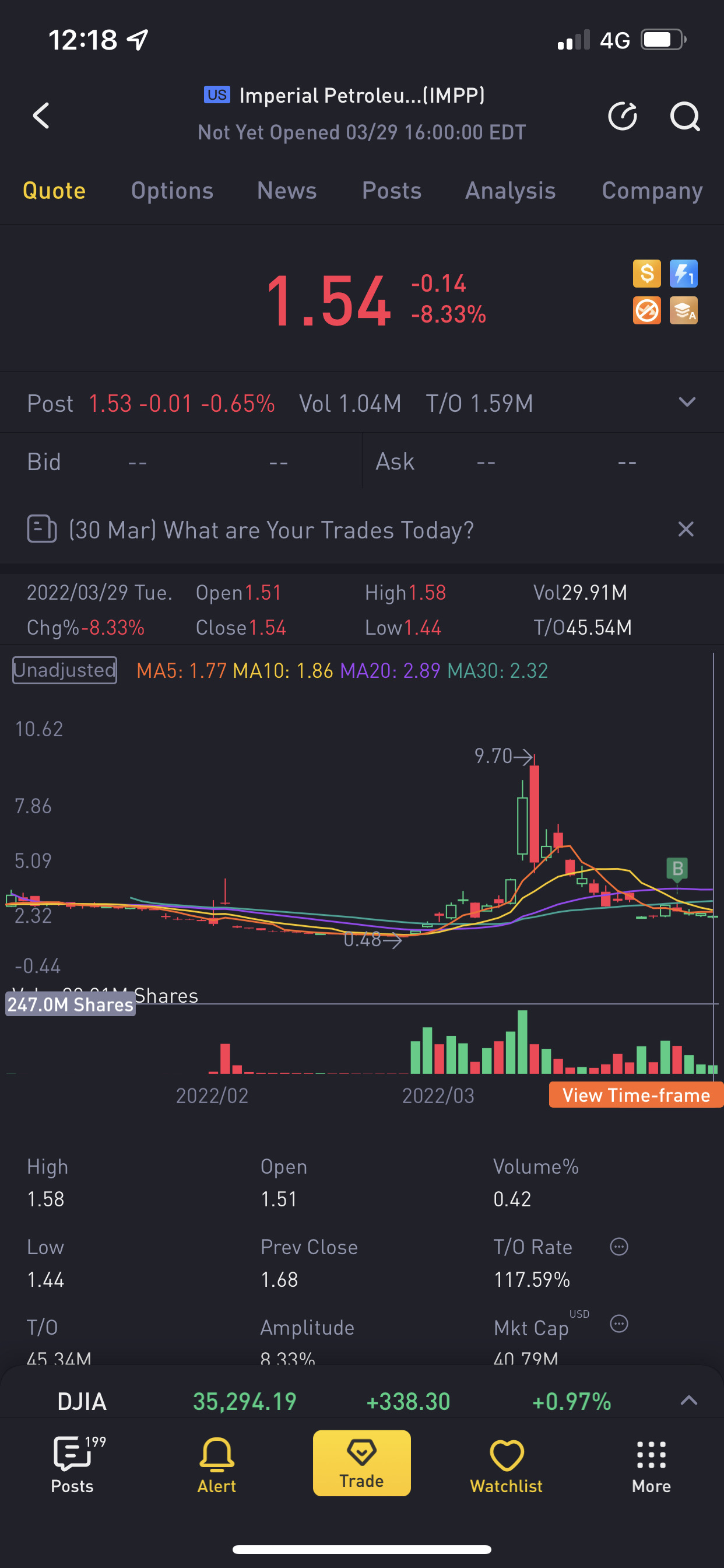 Given the oil prices swing trading and unfortunately the negative EPS that IMPP posted yesterday,the stock went down on open, but as mentioned, did not go further below 1.44 and slowly raised towards the same day's opening price and managed to cross it, as we observed earlier. These give us some bullish signals to the stock, as it is looking like a textbook chart for a squeeze back to $2levels, whether it will go to $3-$4 levels as predicted by Tiger Trade is dependent on stock volume and other news factors such as how the US Market on that day, how oil is trading, the conflicts of Russia-Ukraine and those relating to oil, and definitely last but not least, news from IMPP company! These are factors that can affect movement of IMPP, sentimental factors should be included as well, AMC is a very good example of this!