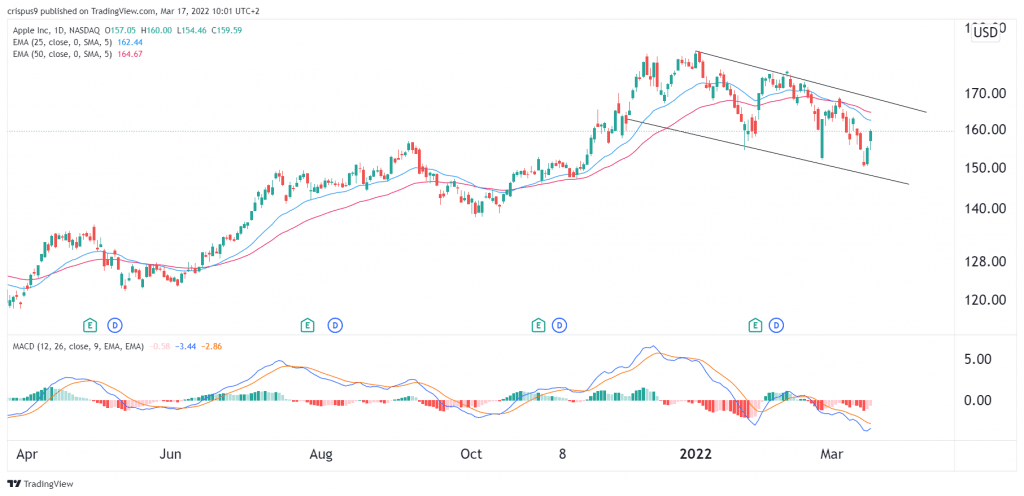 Apple share price has not been spared in the ongoing sell-off of American tech companies. TheAAPLstock is trading at $159, which is about 12.2% below its highest level this year, meaning that it is in a correction zone. However, it has outperformed other FAANG and technology companies. Apple, like other American companies, is facing significant challenges as the current geopolitical events continue unfolding. For example, the cost of building key products like the iPhone and iMac has jumped sharply because of the rising commodity prices and wages.