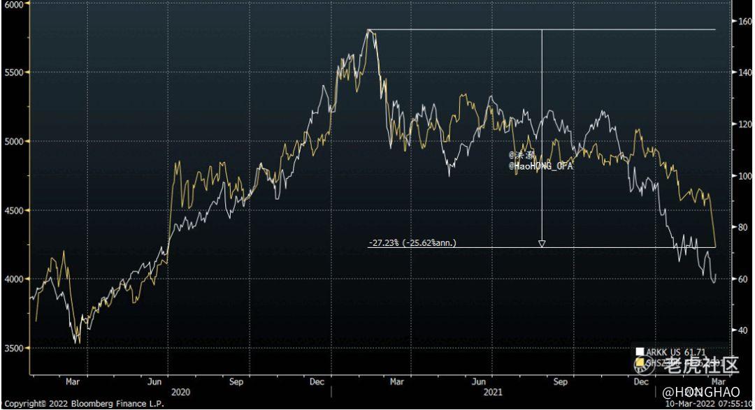 We believe the Chinese market is going through a “growth scare”. The CSI300 is showing very close correlation with Ark Innovation ETF, the prominent growth funds led by Cathie Woods (Figure 2). Such close correlation between two indices that are a world apart suggests that both are being swayed by the similar macroeconomic factors.