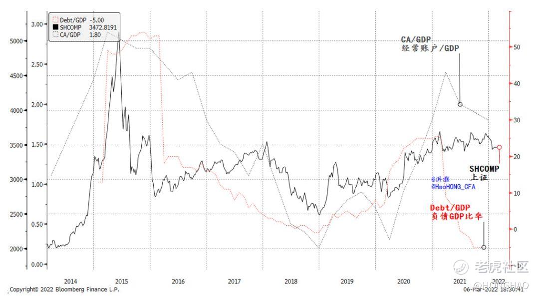 This observation of macro leverage is also consistent with our framework of forecasting 2022, by examining how the changes in macro accounts correspond to stock market performance. As China’s exports slow to its normal rate of growth in 2022, current account surplus as a percentage of GDP will fall. Such a decline in the surplus ratio will be consistent with a change in China’s role as a global production and export center since the onset of the pandemic. Slower foreign consumption (i.e. exports) but slightly improving domestic consumption will mean peaked surplus and a steady macro leverage ratio. Hence, the onshore stock market is unlikely to be helped by this macro shift (Figure 1).